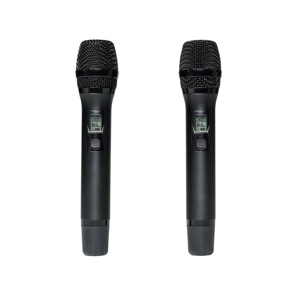– 2 tay micro không dây dBacoustic nhỏ gọn, làm bằng hợp kim phủ nano chống trầy xước, chống bám vân, tạo cảm giác thoải mái cho người dùng khi cầm nắm. Trên thân micro không dây này cũng được trang bị 1 màn hình LCD nhỏ hiển thị tần số, dung lượng pin và 1 nút nguồn mềm, rất dễ thao tác.