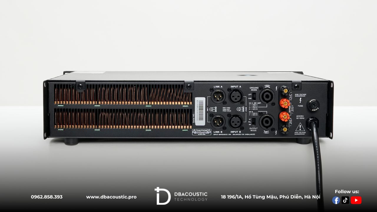 – Mặt trước gồm các núm điều chỉnh âm lượng cho từng kênh, công tắc nguồn và hệ thống lỗ tản nhiệt lớn giúp duy trì nhiệt độ hoạt động ổn định. Mặt sau là các cổng kết nối âm thanh và tín hiệu được bố trí khoa học, dễ thao tác trong quá trình lắp đặt.