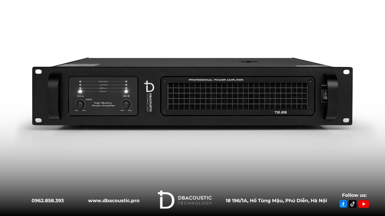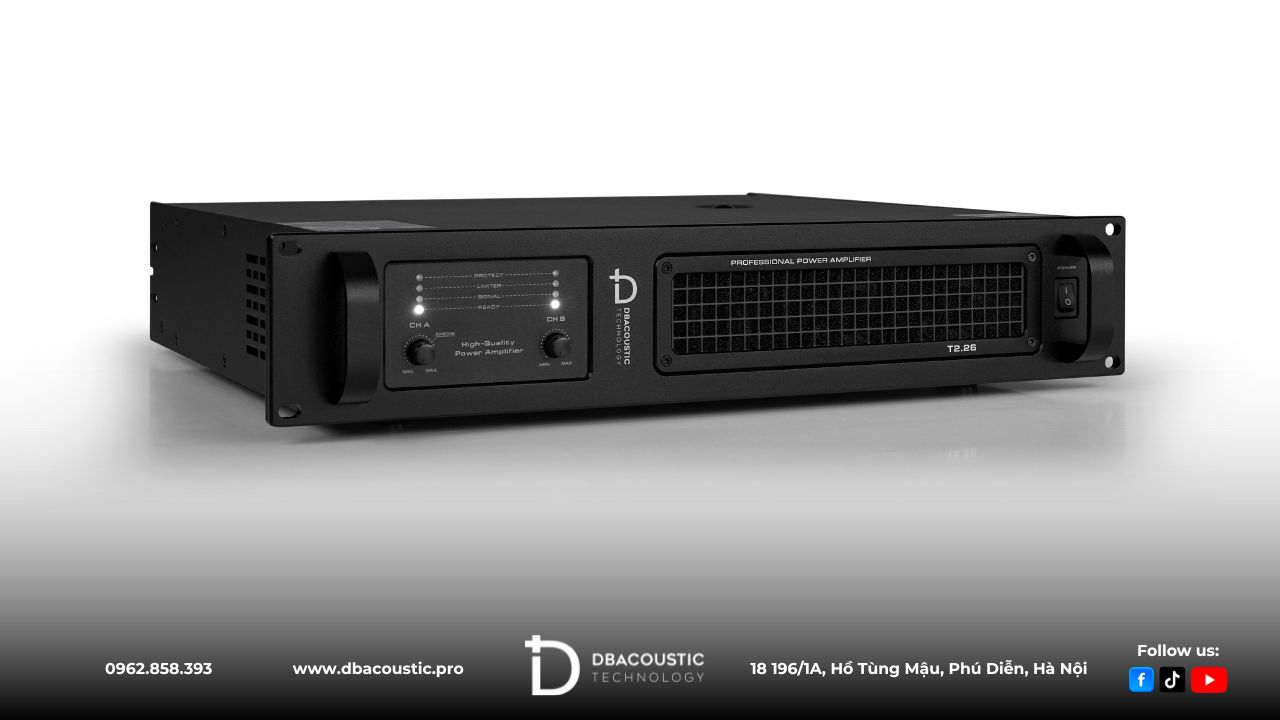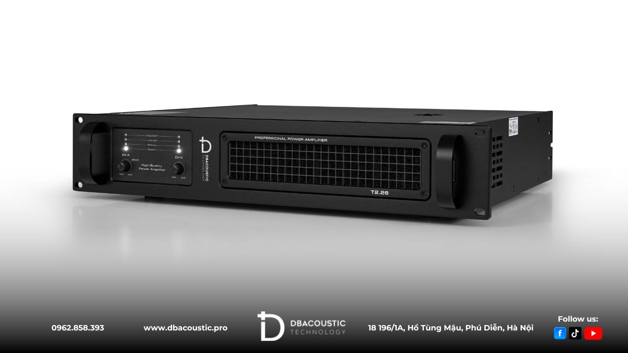 DBacoustic T2.26 là mẫu cục đẩy 2 kênh công suất lớn được thiết kế đặc biệt để tối đa hoá hiệu năng của loa sub, tối ưu hóa dải trầm và duy trì độ ổn định ngay cả khi hoạt động cường độ cao. Với công suất 2 × 1800W @ 8Ω và 2 × 2600W @ 4Ω, cùng công nghệ khuếch đại Class H+ thế hệ mới, T2.26 mang đến chất âm mạnh mẽ, lực bass sâu – chắc – uy lực, phù hợp cho âm thanh sự kiện, sân khấu, hội trường hoặc hệ thống karaoke cao cấp.