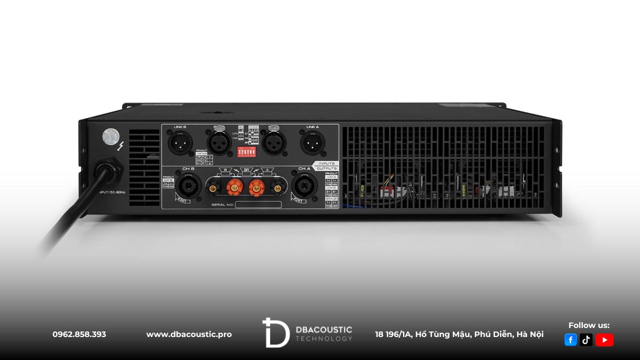 Cục đẩy công suất Dbacoustic trang bị mạch Class H+ giúp tối ưu hiệu năng, giảm tiêu thụ điện, hạn chế nhiệt lượng sinh ra khi chạy ở tải nặng. Đồng thời đó là bảo đảm hiệu suất âm thanh luôn ở mức cao nhất (hiệu suất năng lượng đạt 86%).