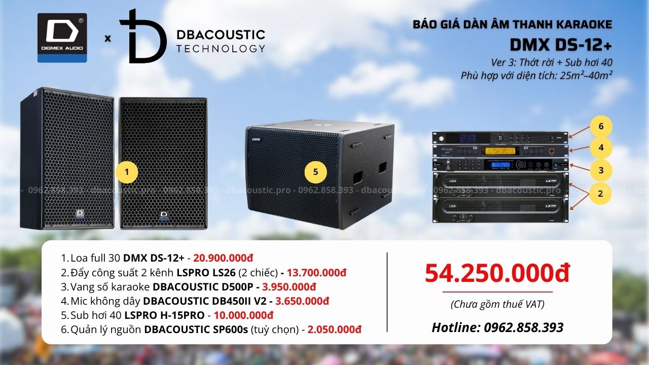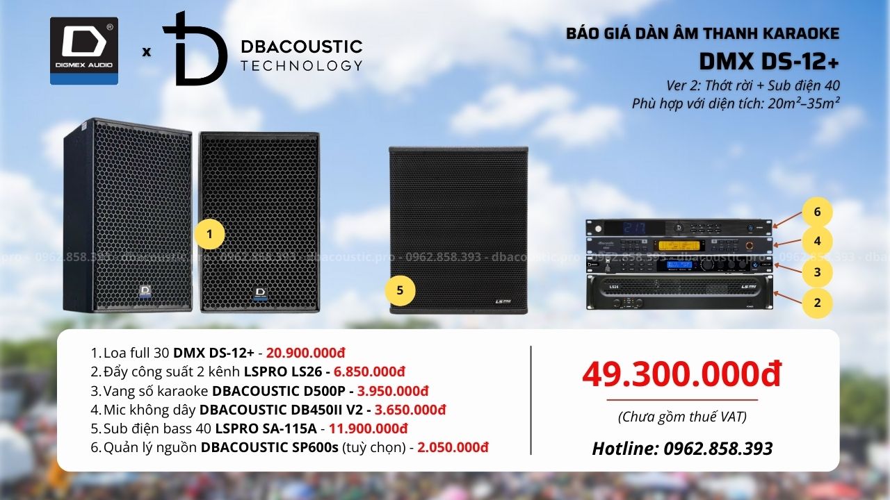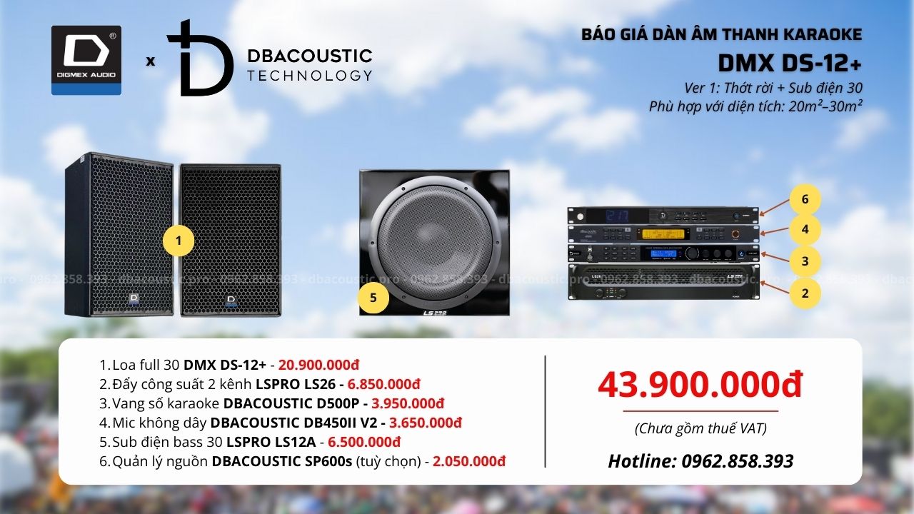 DMX DS-12+ là lựa chọn thực dụng, dễ chơi, dễ dùng, phù hợp với đa số gia đình muốn đầu tư dàn karaoke bass 30 khỏe, hát thoải mái và ổn định lâu dài. Với 3 cấu hình rõ ràng, người dùng có thể chọn đúng theo diện tích phòng và mức đầu tư, tránh mua thừa hoặc thiếu công suất. Nếu bạn đang phân vân chưa biết cấu hình nào phù hợp với diện tích phòng, nhu cầu hát thực tế hay cách bố trí không gian, hãy liên hệ trực tiếp hotline 0962.858.393 để được chuyên viên DBacoustic.pro tư vấn cụ thể theo từng trường hợp.