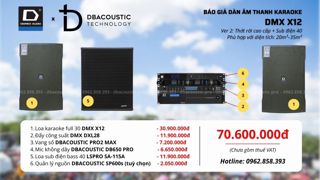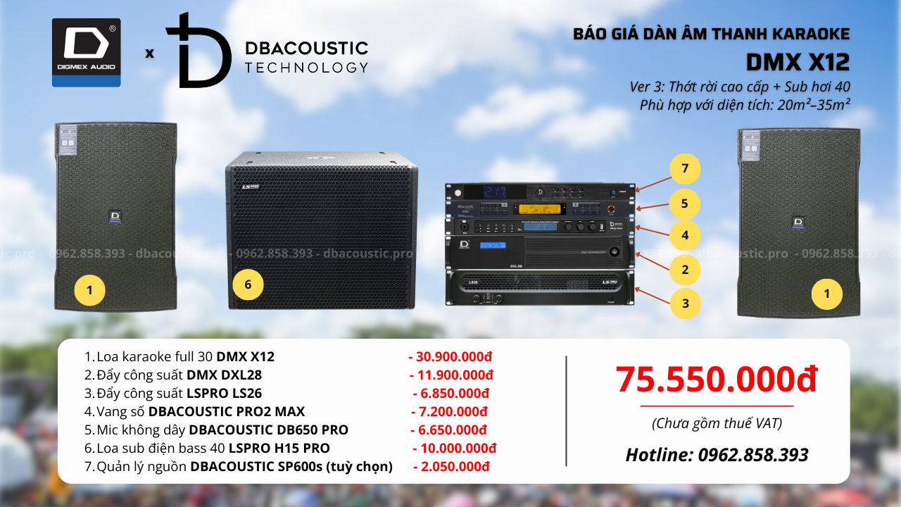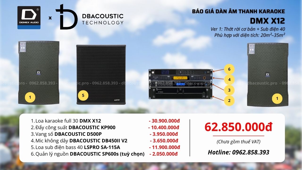 DMX X12 là dòng dàn karaoke mạnh mẽ – chính hãng – dễ chơi – nâng cấp linh hoạt, phù hợp nhiều mức nhu cầu khác nhau. Quan trọng là chọn đúng cấu hình theo diện tích phòng và gu nghe, tránh lắp thừa hoặc thiếu công suất. Nếu bạn đang phân vân chưa biết cấu hình DMX X12 nào phù hợp với không gian và nhu cầu thực tế, hãy liên hệ trực tiếp hotline 0962.858.393 để được tư vấn chi tiết.