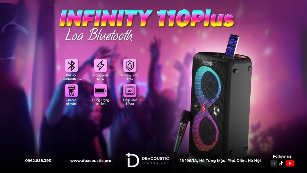 Loa di động DBAcoustic Infinity 110Plus là dòng loa di động kết nối bluetooth có khả năng nghe nhạc, hát karaoke tuyệt vời. Loa thích hợp cho các hoạt động trải nghiệm ngoài trời, camping,… cực kỳ phù hợp bởi dung lượng pin cao, chất âm hay.
