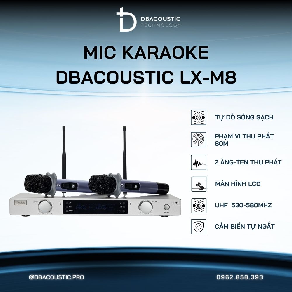 Micro không dây DBAcoustic LX-M8 sở hữu chất âm ấn tượng, dành cho karaoke gia đình, phân khúc karaoke cao cấp hay các công trình sự kiện chuyên nghiệp