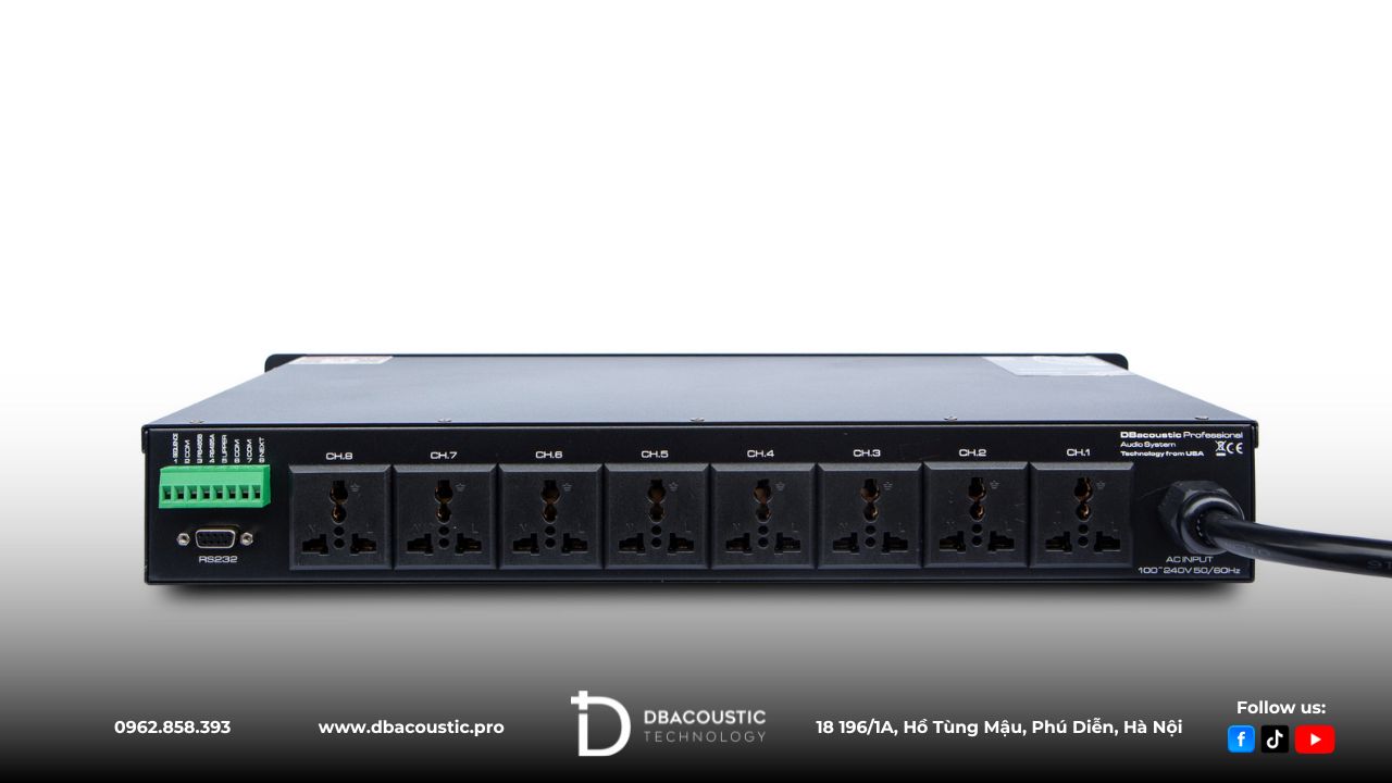 - Mặt sau gồm 8 ổ cắm nguồn chính (CH1–CH8), 1 cổng điều khiển từ xa RS232, và một ổ nguồn phụ luôn có điện.